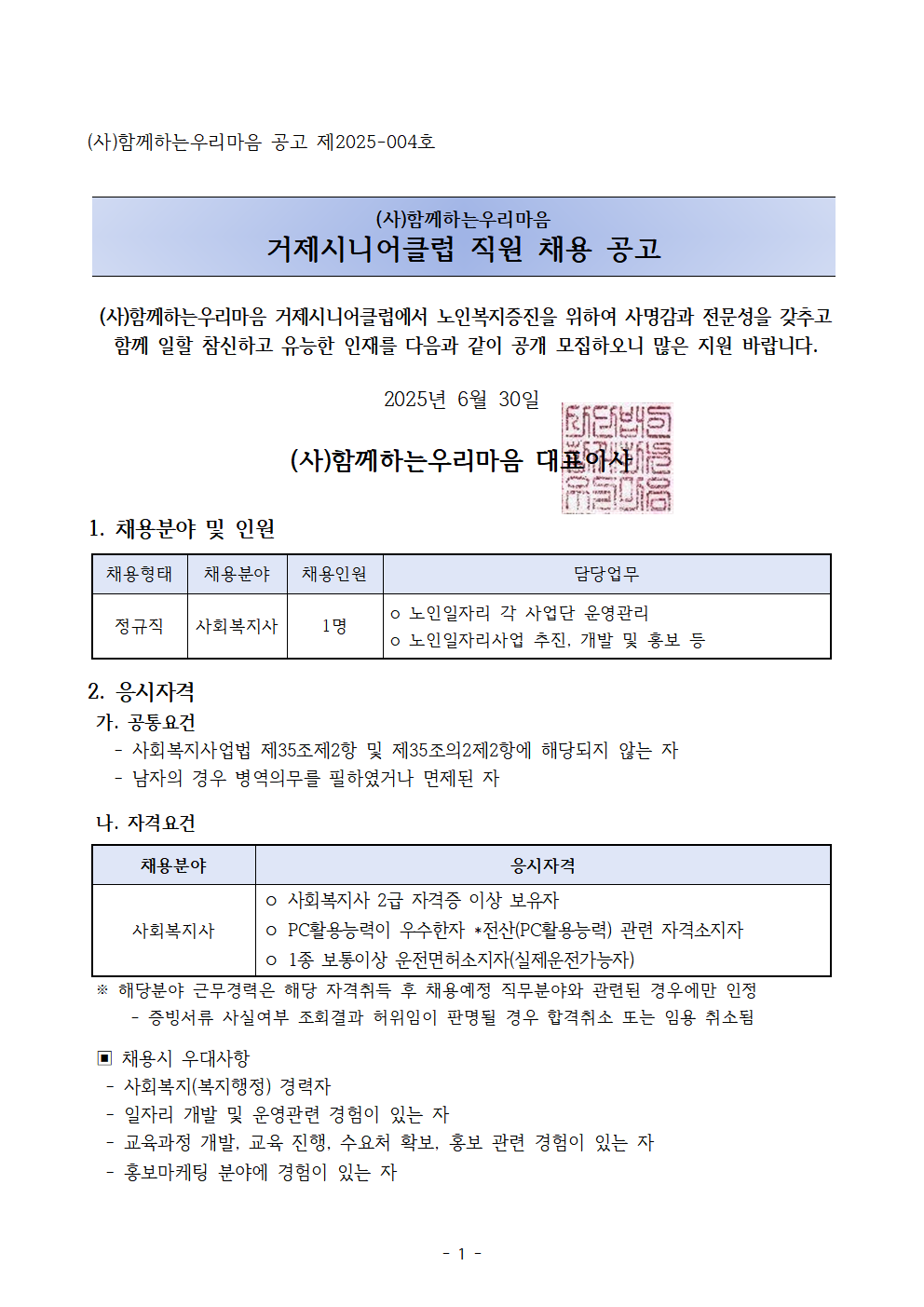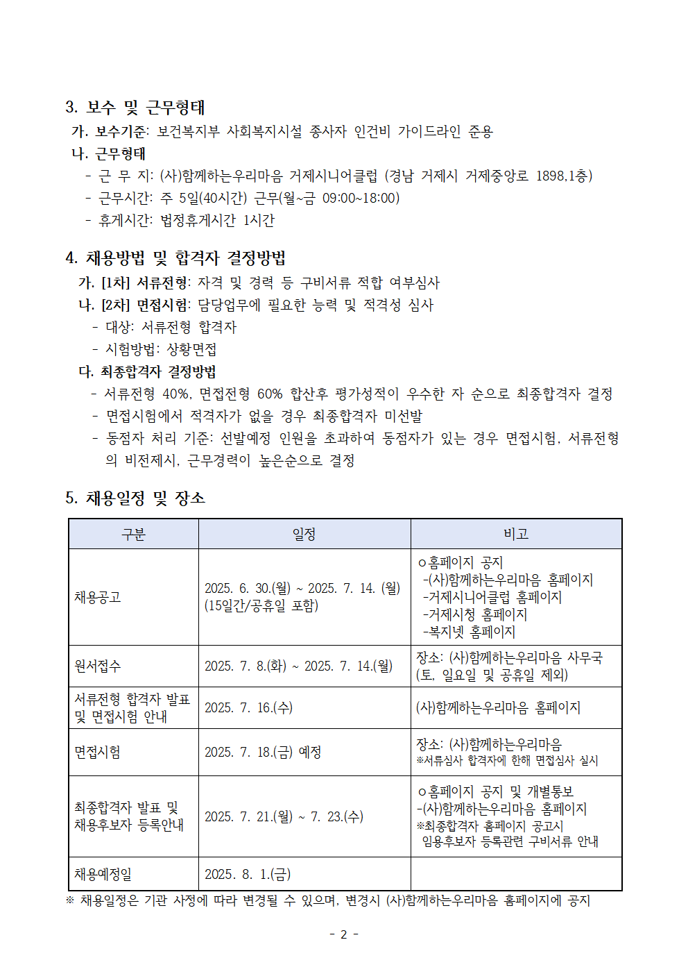 거제시니어클럽 2025년 노인일자리 및 사회활동지원사업 담당자 채용 공고